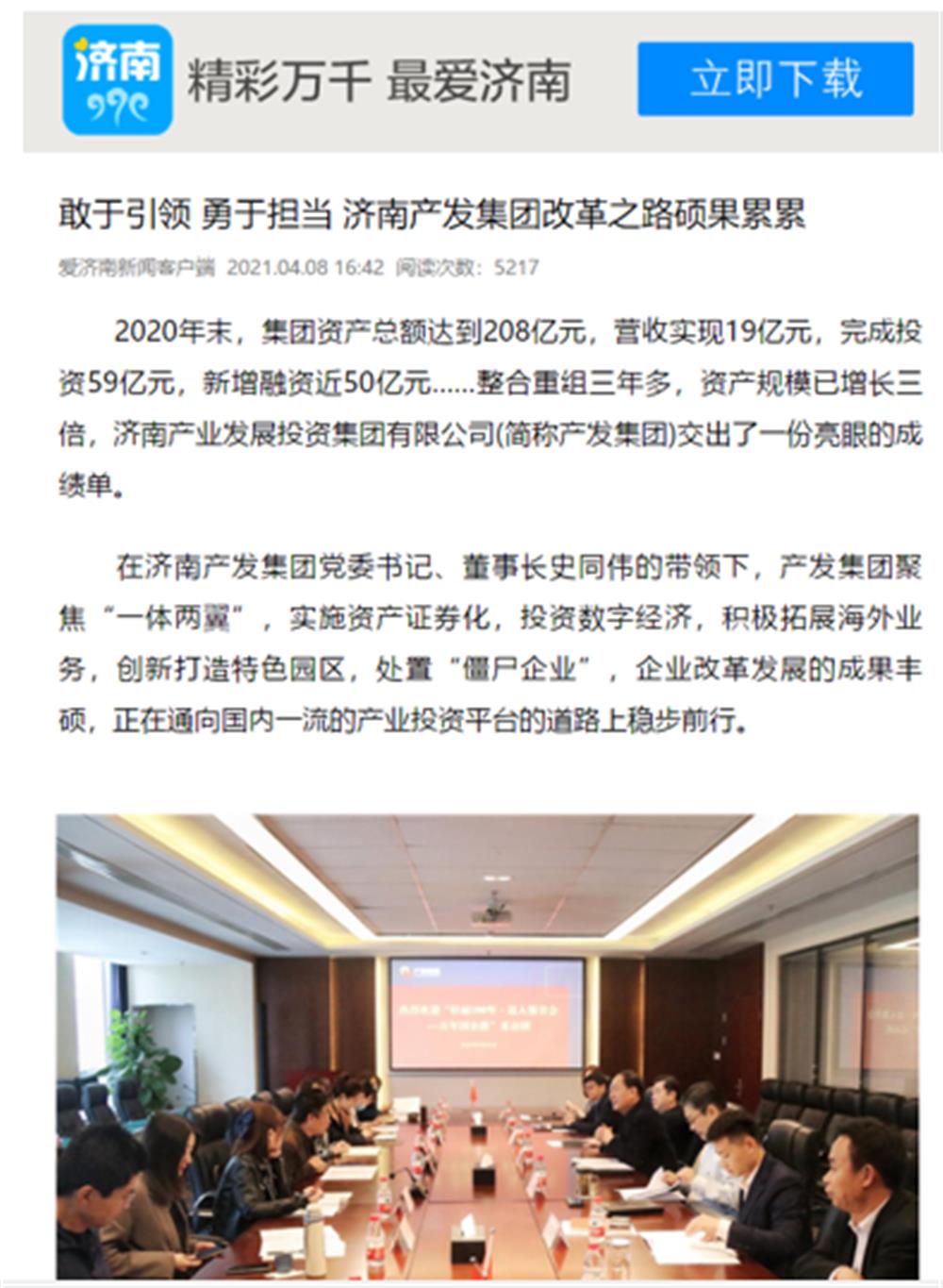近日,市國(guó)資委舉辦的“壯麗100年·邁入強(qiáng)省會(huì)——百年國(guó)企路”媒體團(tuán)一行到訪濟(jì)南產(chǎn)發(fā)集團(tuán)后,人民網(wǎng)、大眾網(wǎng)、閃電新聞、濟(jì)南電視臺(tái)、濟(jì)南日?qǐng)?bào)、帶濟(jì)南等多家國(guó)家、省市級(jí)媒體聚焦報(bào)道了集團(tuán)改革發(fā)展的成果經(jīng)驗(yàn)。