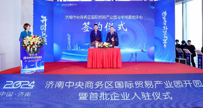 在入駐簽約環(huán)節(jié),濟南國商園區(qū)運營管理有限公司總經(jīng)理陳蕾與華潤置地中心項目負(fù)責(zé)人李靜宜簽訂了委托運營協(xié)議;劉燕飛、趙冬梅、褚征分別代表濟南市商務(wù)局、濟南市歷下區(qū)人民政府、濟南產(chǎn)發(fā)集團共同簽署《共同促進開放型經(jīng)濟高質(zhì)量發(fā)展合作框架協(xié)議書》;王紅、楊傳軍、趙治文、楊福濤、王海清、黃蓓、邵丹丹共同按下啟動開園按鈕,宣告濟南中央商務(wù)區(qū)國際貿(mào)易產(chǎn)業(yè)園正式開園。
